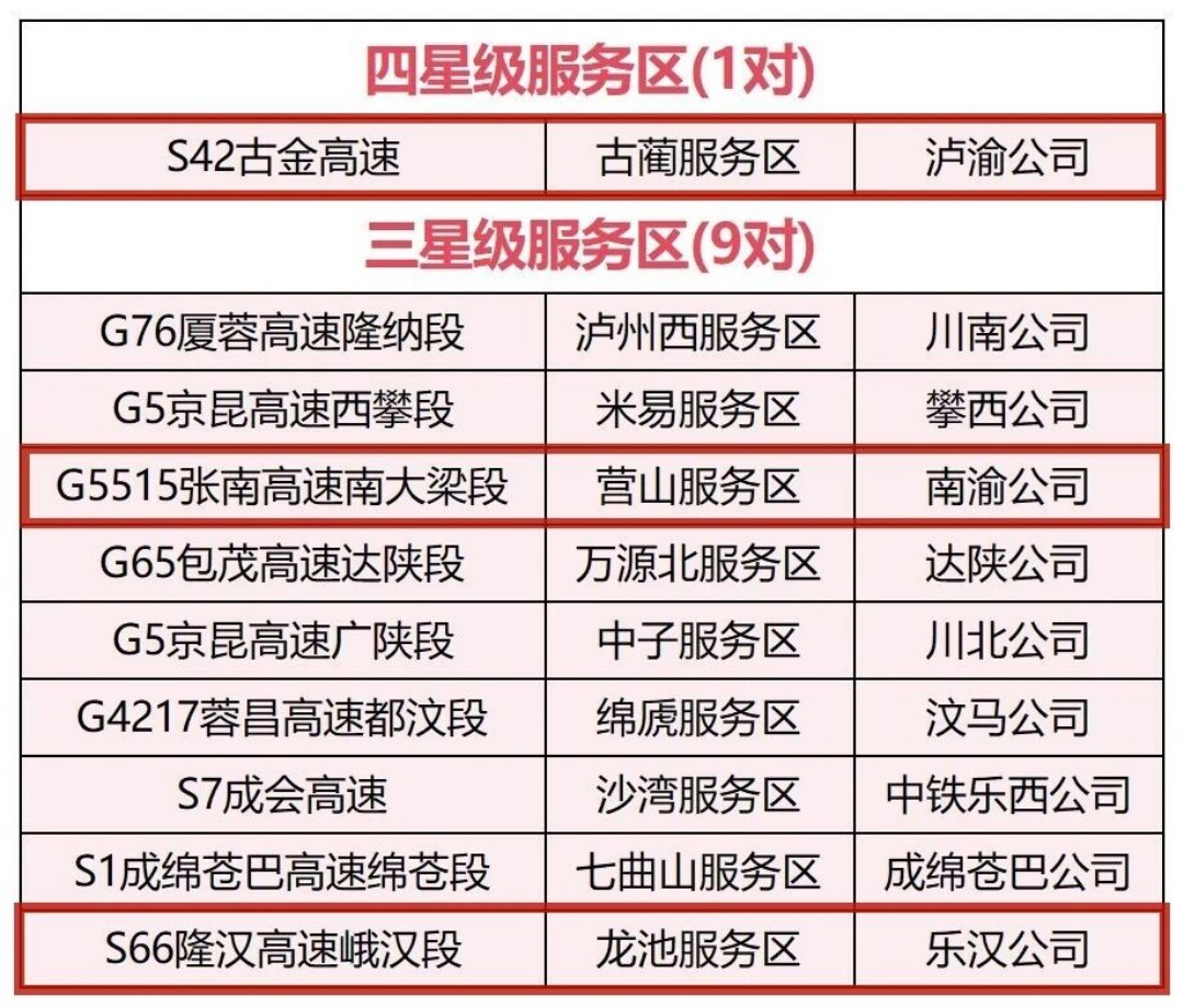 近日,四川省交通运输综合行政执法总队、四川省交通运输厅高速公路管理局联合印发了《关于2025年全省高速公路服务区星级评定结果的通知》,BETWA西汉姆联官方官网多家所属公司运营服务区上榜——泸渝公司古蔺服务区获评2025年度全省唯一“四星级服务区”称号,南渝绵南公司营山服务区、乐汉公司龙池服务区获评“三星级服务区”称号!