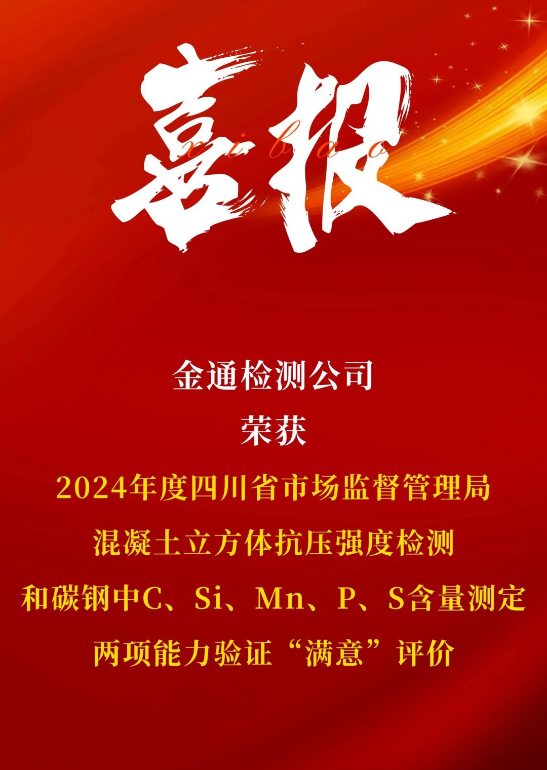 2024年,金通检测公司质量与技术管理工作成绩喜人,在刚刚获得中国交通建设监理协会4A级检测机构评价之后,在能力验证领域再传捷报,获得2024年度四川省市场监督管理局混凝土立方体抗压强度检测和碳钢中C、Si、Mn、P、S含量测定两项能力验证“满意”评价。