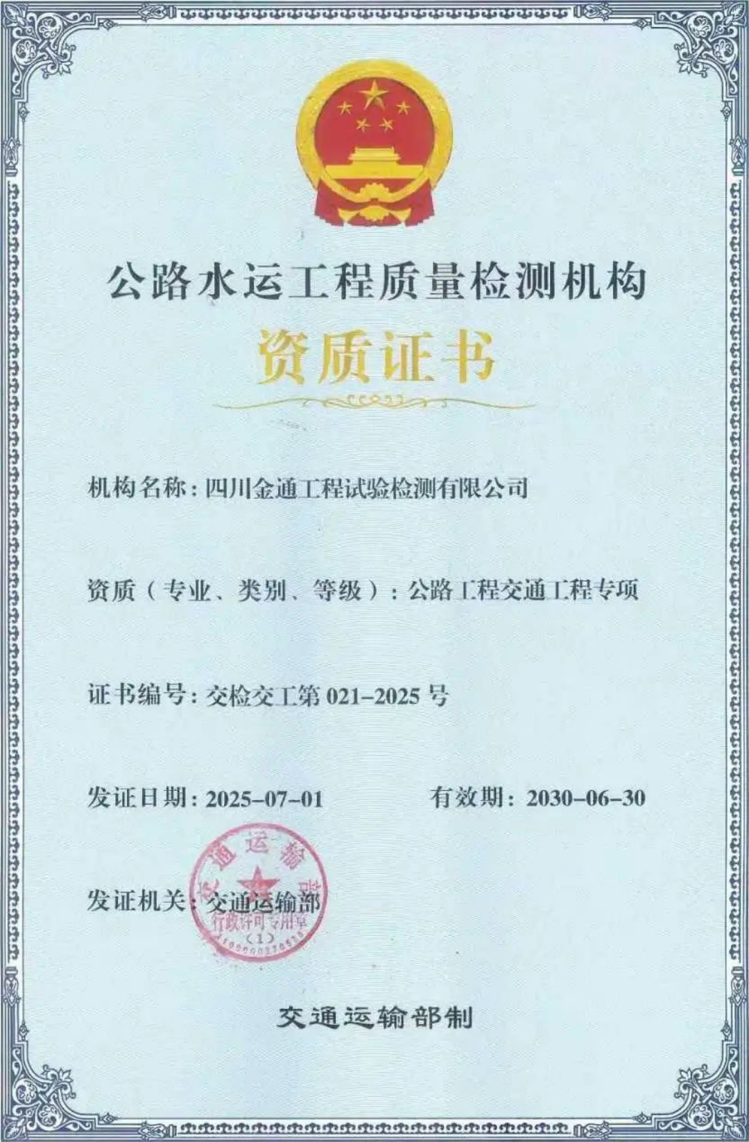 近日,交通运输部公布了公路水运工程质量检测机构资质许可决定,BETWA西汉姆联官方官网金通检测公司成功获颁公路工程交通工程专项资质证书。这一重要资质的获得,标志着金通检测公司在公路工程交通工程领域的专业能力、技术实力和综合竞争力迈上新台阶,为公司进一步拓展业务、更好地服务于公路工程交通建设事业奠定坚实基础。