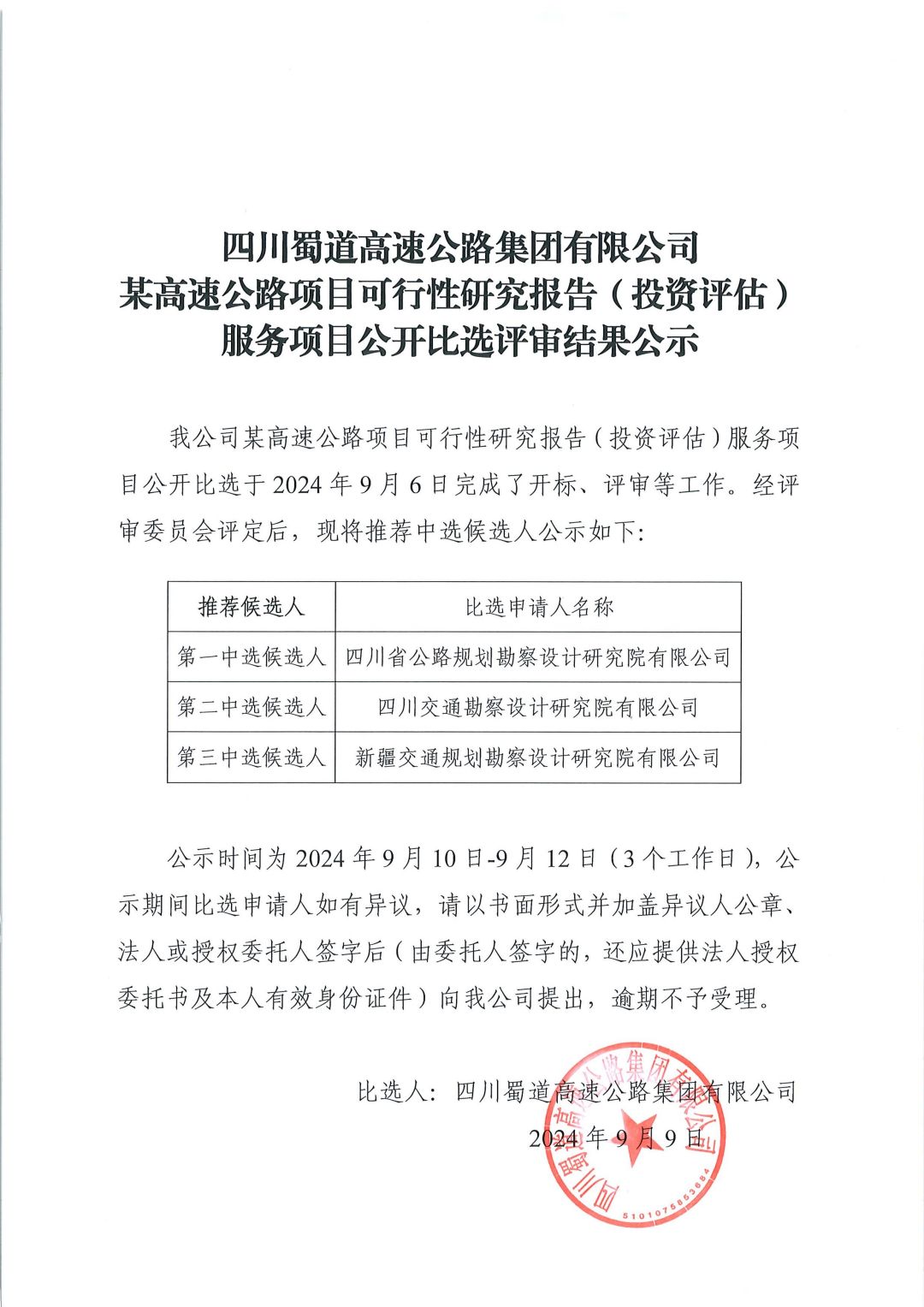 蜀高某高速公路项目可行性研究报告(投资评估)服务项目公开比选评审结果公示