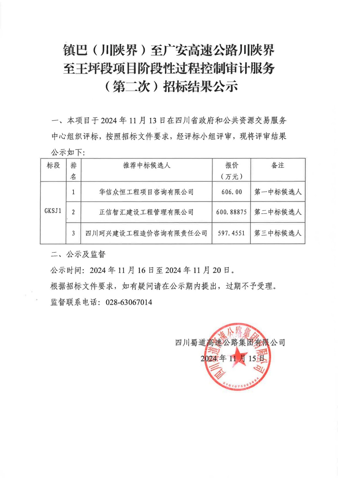 镇巴(川陕界)至广安高速公路川陕界至王坪段项目阶段性过程控制审计服务(第二次)招标结果公示