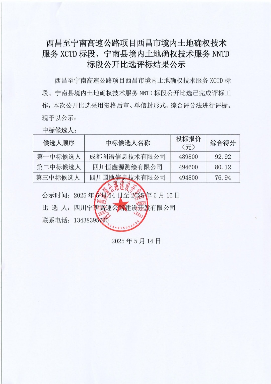 西昌至宁南高速公路项目西昌市境内土地确权技术服务XCTD标段、宁南县境内土地确权技术服务NNTD标段公开比选评标结果公示