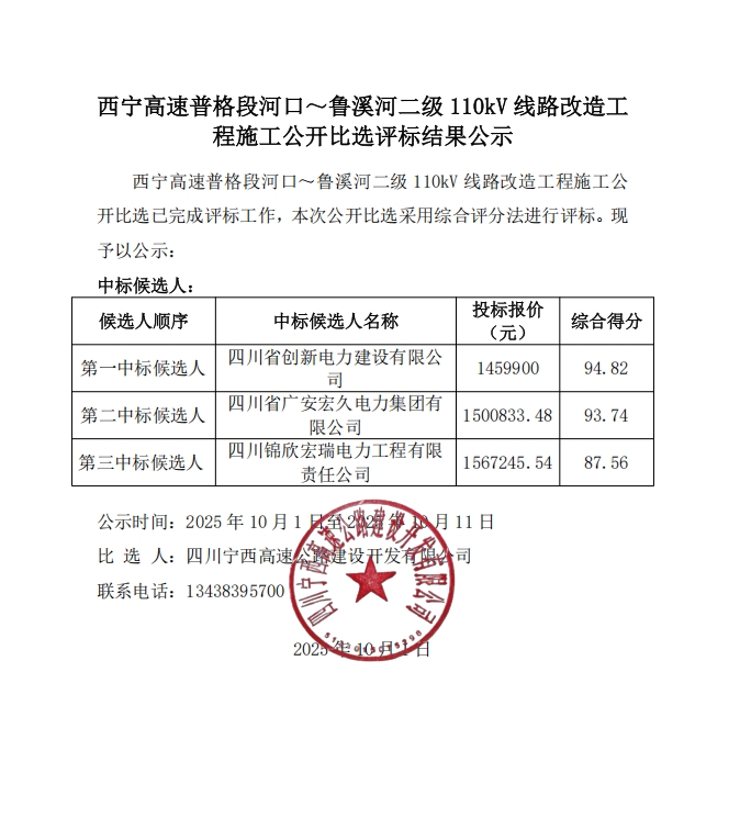 西宁高速普格段河口~鲁溪河二级110kV线路改造工程施工公开比选评标结果公示