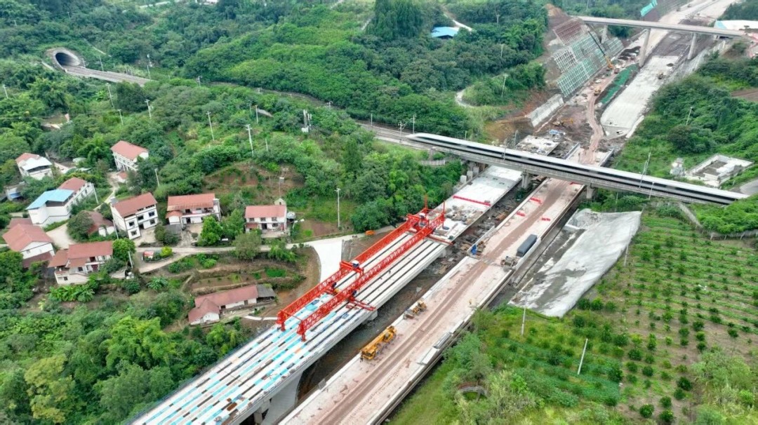 杨柳滩沱江特大桥全长906米,本次架设完成的为引桥段,全长280米。该桥现浇箱梁段下穿成渝高铁,为保障成渝高铁桥墩和线路安全,项目各参建单位在施工前制定了详细下穿高铁施工专项方案和应急预案,并与成都铁路局紧密协调,利用高铁“空窗期”进行限时施工,对高铁桥墩及轨道进行实时位移和沉降监测。