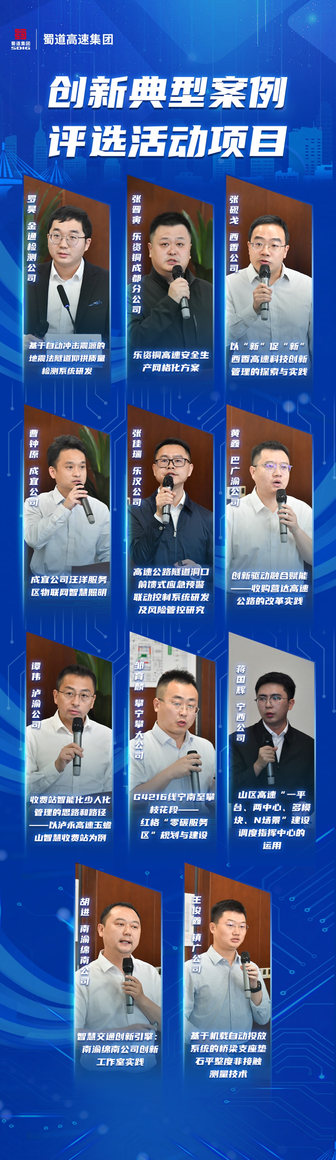 经过激烈的角逐,泸渝公司《收费站智能化少人化管理的思路和路径——以泸永高速玉蟾山智慧收费站为例》荣获“创新蜀高”优秀典型案例第一名,攀宁攀大公司《红格“零碳服务区”规划与建设》荣获第二名,乐汉公司《高速公路隧道洞口前馈式应急预警联动控制系统研发及风险管控研究》荣获第三名。