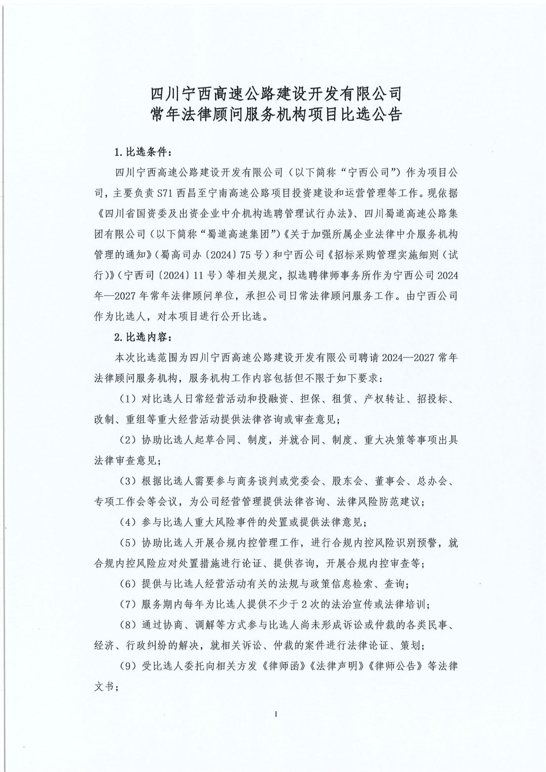 四川宁西高速公路建设开发有限公司常年法律顾问服务机构项目比选公告