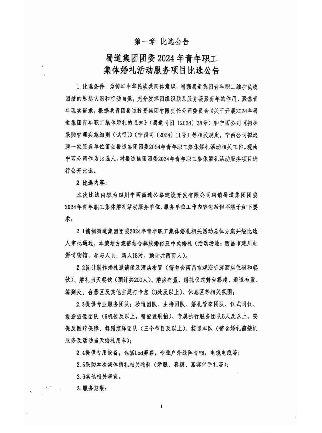 蜀道集团团委2024年青年职工集体婚礼活动服务项目比选公告