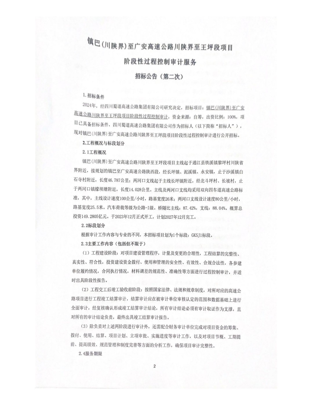 镇巴(川陕界)至广安高速公路川陕界至王坪段项目阶段性过程控制审计服务招标公告(第二次)