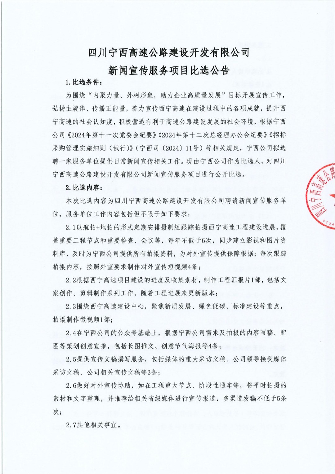 四川宁西高速公路建设开发有限公司新闻宣传服务项目比选公告